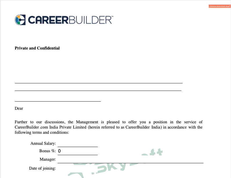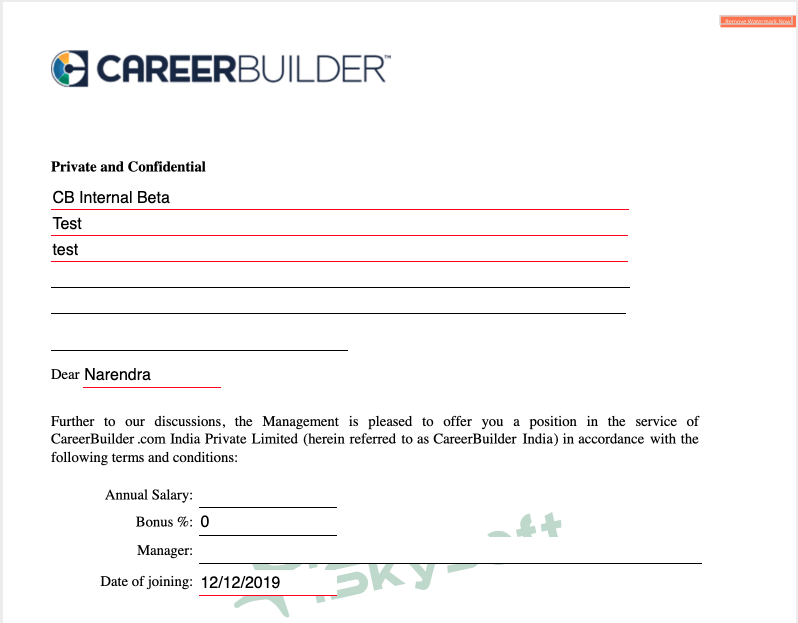 Step 4: When I open the finished letter as a CBAT user the lines are not there. This is what I would expect the letter to look like when the candidate opens the offer letter in the DMS signing portal.