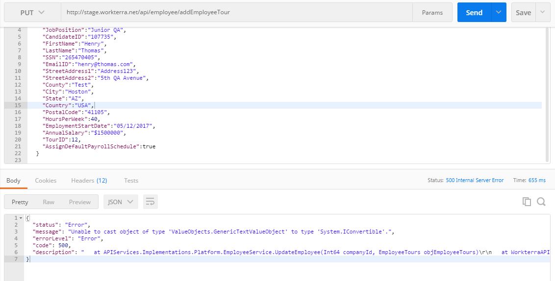 "description": " at APIServices.Implementations.Platform.EmployeeService.UpdateEmployee(Int64 companyId, EmployeeTours objEmployeeTours)\r\n at WorkterraAPI.Controllers.Platform.EmployeeController.updateEmployee(EmployeeTours objEmployeeDTO)"