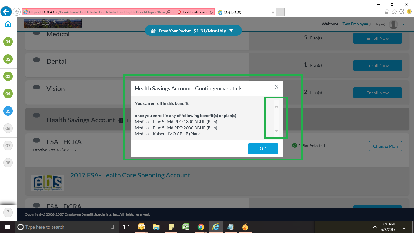 El Dorado - briner2747 Employee UI Relative to 86.0 above, when I clicked on the reason that I wasn't eligible, the list of plans was so long I was stuck and couldn't move out of it aside from logging out. Again - Vision shouldn't have even showed up and I should never see plans listed that I am not eligible to be enrolled in.