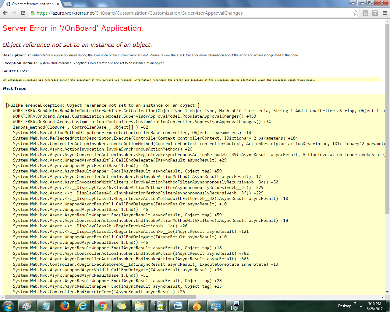 Web Error Log : at WORKTERRA.BenAdmin.BenAdminControllerWebTier.GetCollection(ObjectType I_objectType, Hashtable I_criteria, String I_AdditionalCriteriaString, Object I_context, Boolean I_mode, Boolean I_needCollection) in c:\WT\branches\UiRefresh\Web\ControllerWebTier\ControllerWebTier\BenAdminControllerWebTier.cs:line 170