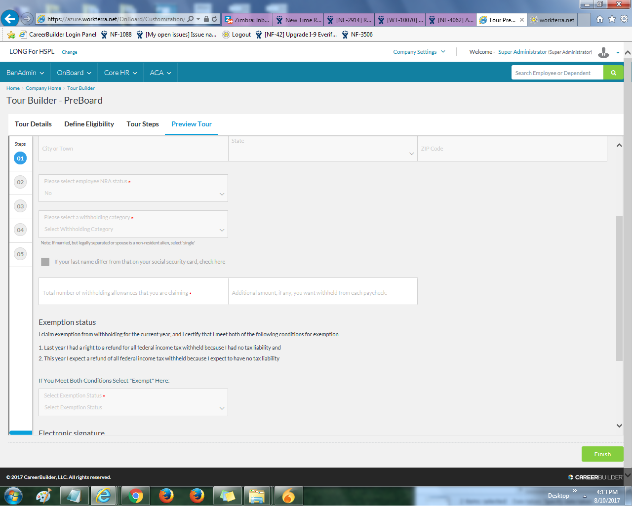 on Azure, in SA login, while creating a Pre-Board Tour, if preview tab is selected, in W4 form, NRA status field is displayed incorrectly. PFA screen shot.
