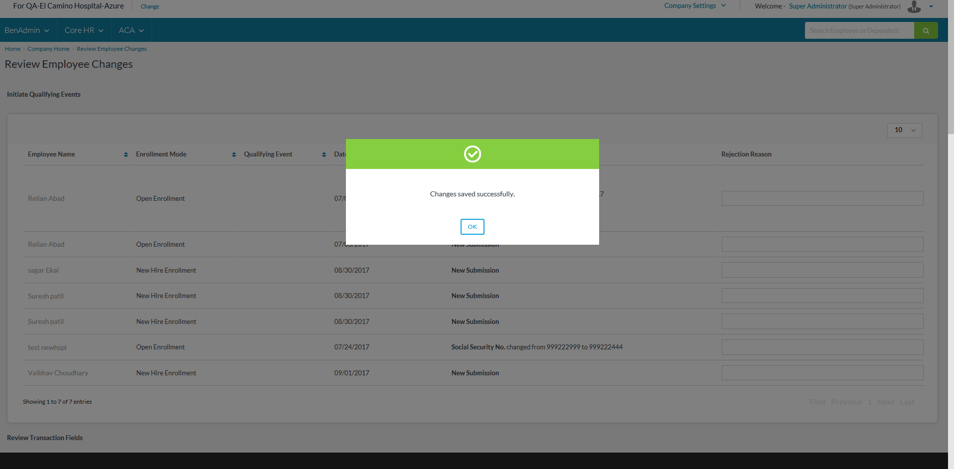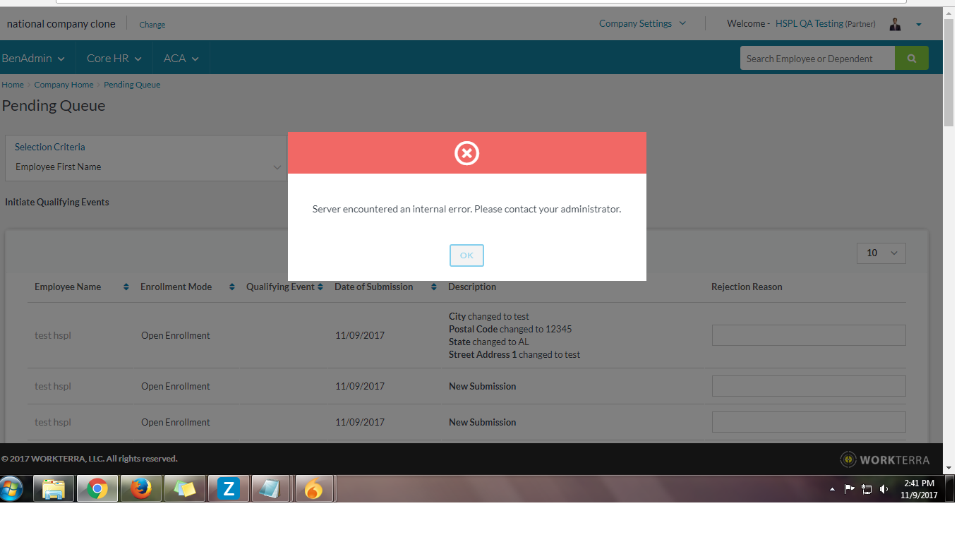 When We Accept Intiate qualifying event data from Pending Queue or employee review changes page then system throws server error.