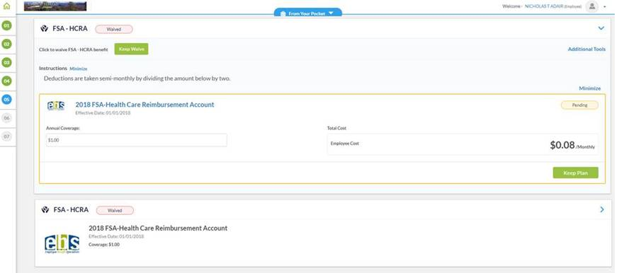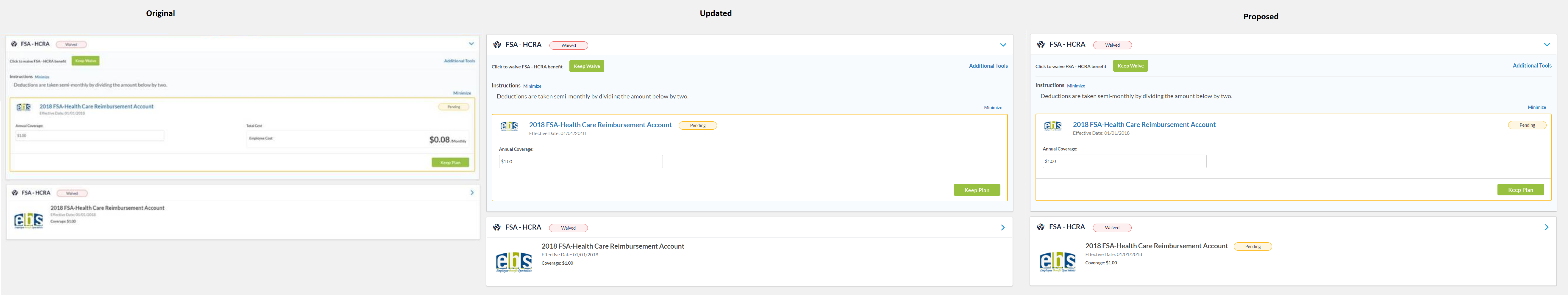 Comments: For FSA-HCRA, it was originally waived. I enrolled with $1 coverage. On expansion, I can see the Pending button for $1. However within collapsed view, it is showing Waived button but with coverage of $1.00. For the collapsed view, wondering if we should either