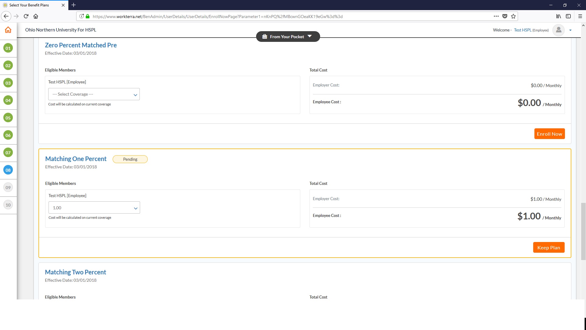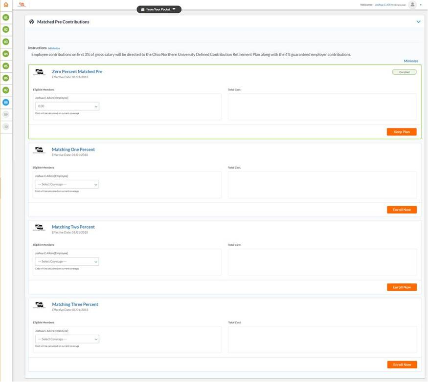 Comments: For ‘Matched Pre Contributions’, the default order of the 4 plans is ‘Zero Percent Matched Pre’, ‘Matching One Percent’, ‘Matching Two Percent’ then ‘Matching ‘Three Percent’ (see screenshot 1). Oddly when you have selected a plan, it become listed on top (see screenshot 2). The same happens for ‘Voluntary Contributions’. Can we retain the order of the plans?