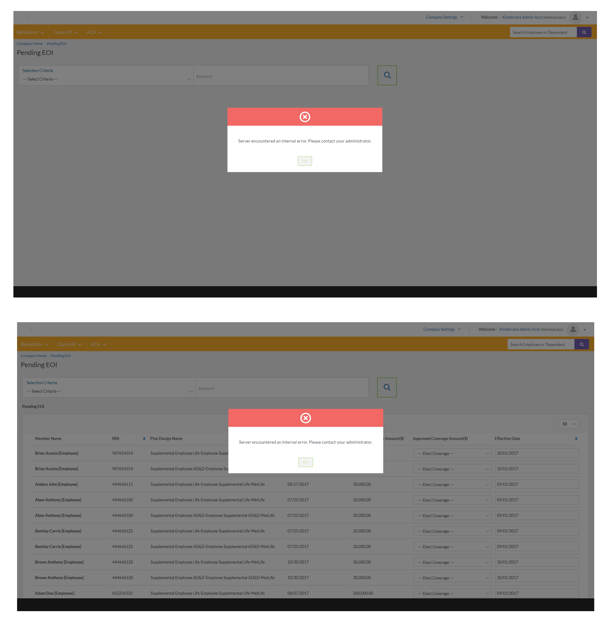 Comments: If you click from actionable counter, it will trigger this error but not from BenAdmin navigation even though both are routing to same link and same criteria. Seconds after the error prompt show, the report does load and if you close the prompt, you can access the report.