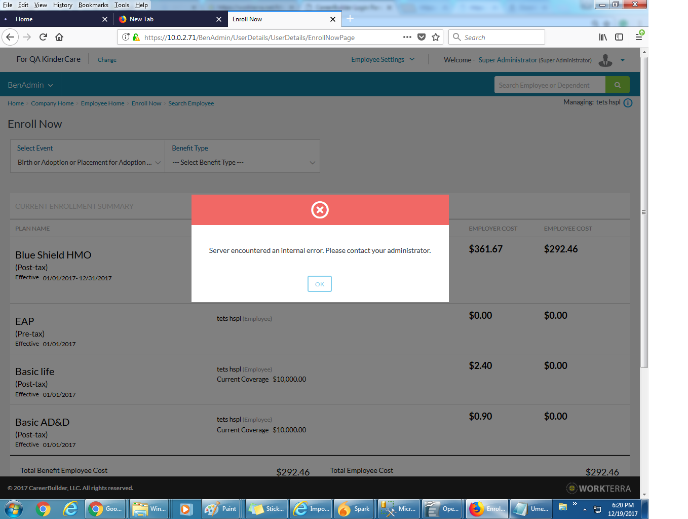 App Error Log : ControllerAppTier.GetCollection->BenAdminControllerAppTier.GetData->CollectionManager.GetCollection->CollectionManager.GetEligibileBenefitTypesForGivenEffectiveDate->Eligibility.GetEligibleBenefitTypes_EnrollNow->Eligibility.FetchCheckEligibilityForPlanDesign_EnrollNow_Ex