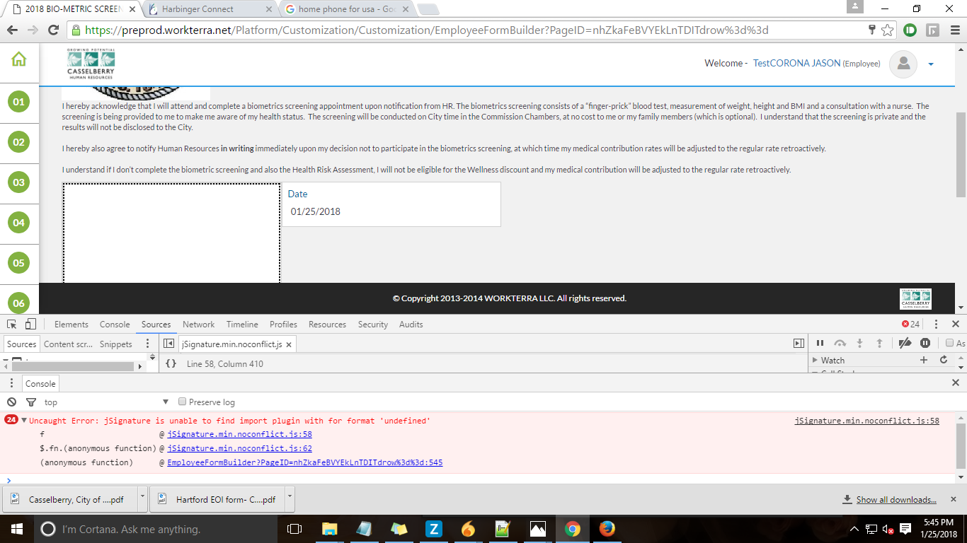 Login employee->traverse self serve mode->go to bio metric screening page->save and continue without giving signature->next page is blocked->give the signature after that->next page is still blocked after giving signature and password.
