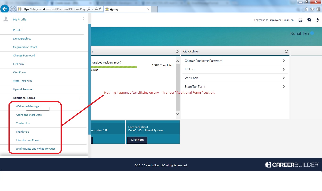 Please note same issue is also exists for "Profile" link under My Profile section. Nothing happens after clicking on this link.