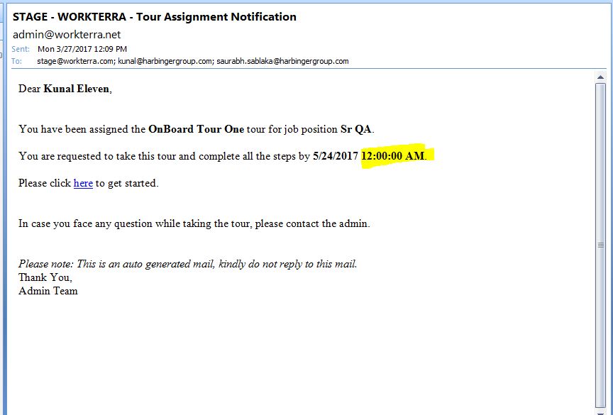 Need to remove timing from tour assignment email notification as employee may get confuse with the timing.