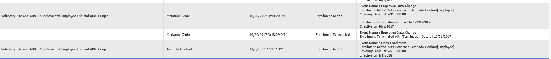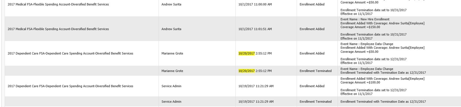 For instance, Andrew Surita - 2017 Dependent Care FSA - he is showing that he had elected $100 on 10/19, however, on 10/20, it is showing that Marianne did a data change (which we are not able to see what triggered this data change) which is now causing the member to show 2 enrollments for 11/1/17 - 12/31/17. We believe that he should only have the $100 coverage.