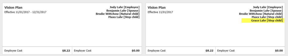 The other member that we saw this on was: Jody lahr - who is showing two vision plans, one of them is dropping one of her children, Grace. Her child Grace should not have been dropped from the coverage.