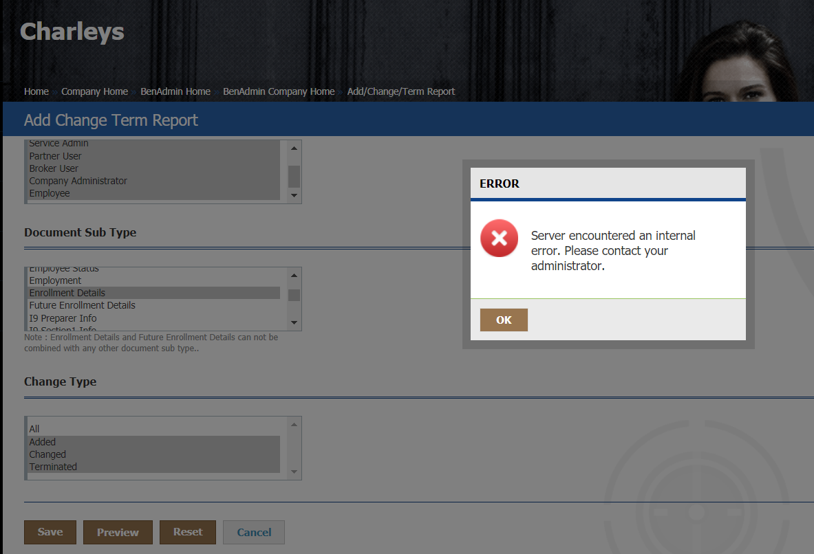 While seting up and saving the report for Charleys. It gives a server error. No issues while previewing it. We are not able to save the report for client and this needs to be scheduled so they can use this for payroll needs.
