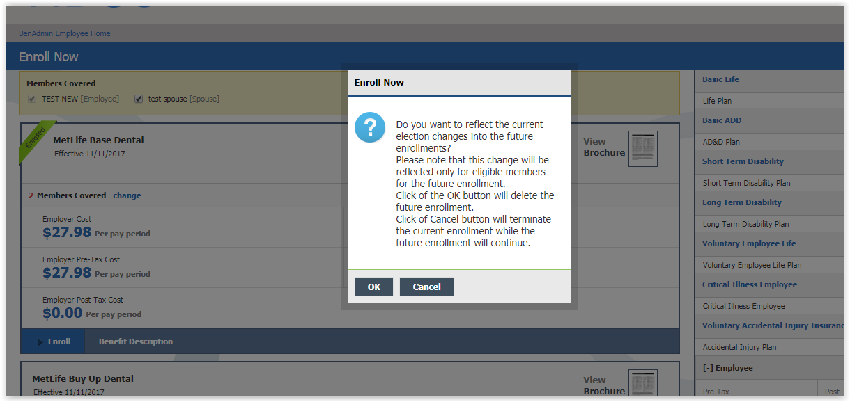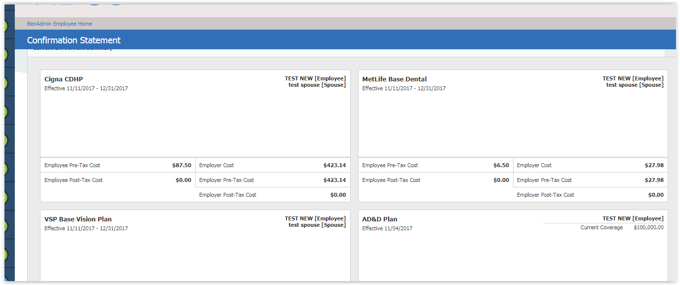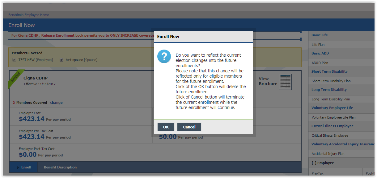 TEST NEW – went through OE and elected benefits for 2018. Created life event effective 11/13 (marriage). I went through life event, I clicked on the “cancel” in pop up box that appears when I added spouse to the medical, dental and vision plans. NO CHANGES to my 2018 elections were made see attached.