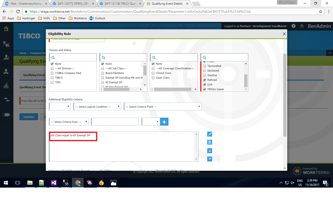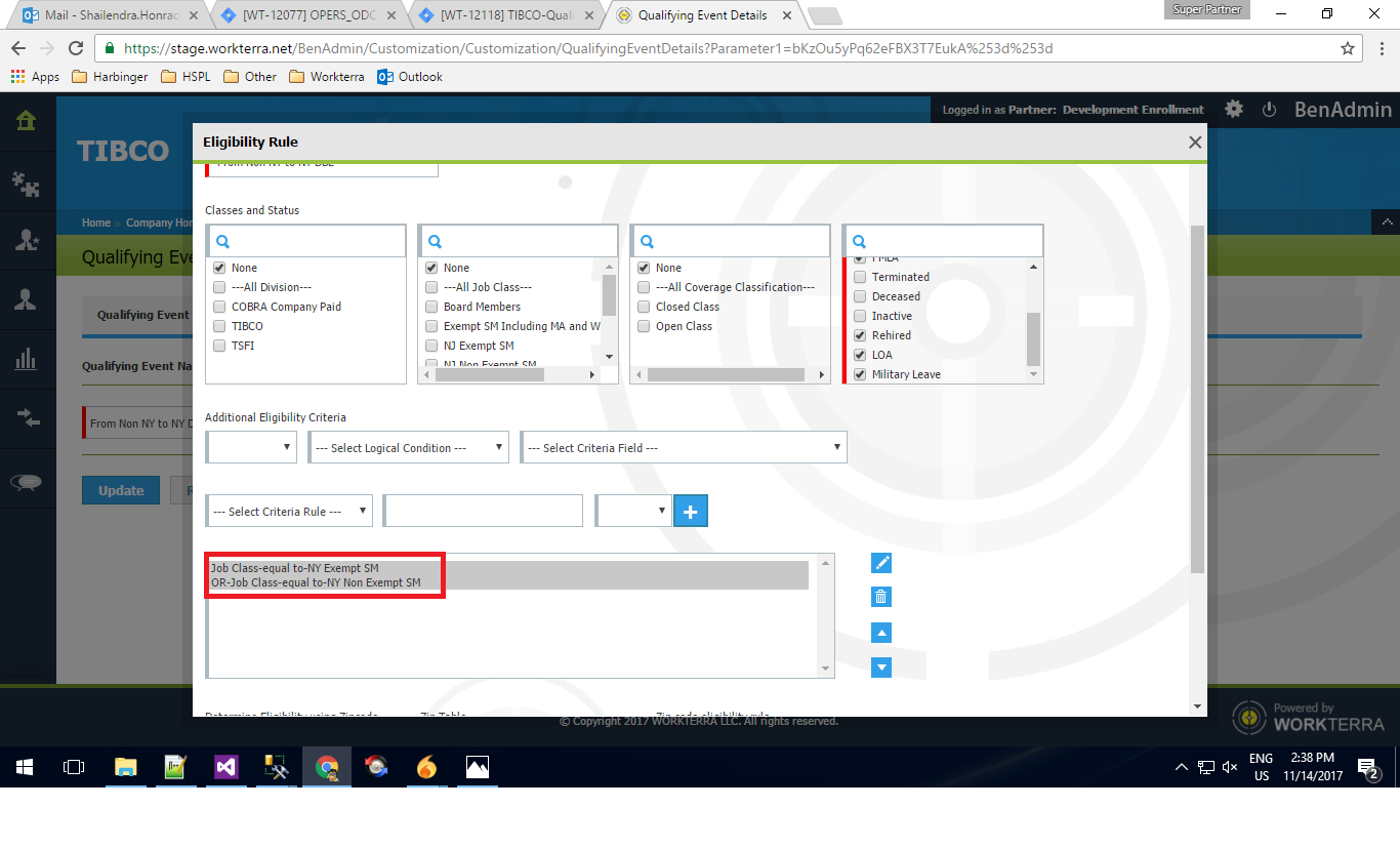 TIBCO HR is requesting screen shots of what happens when a QE event is created between the end of OE and the end of the year when an employee goes through the system to make updates.