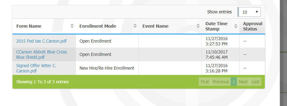 it appears the document upload report is not pulling data for the Open enrollment event. I ran a report using 01/01 12/31/2017 dates. The report sis not show any documents being uploaded within the OE event. I checked a few records and found the following employees