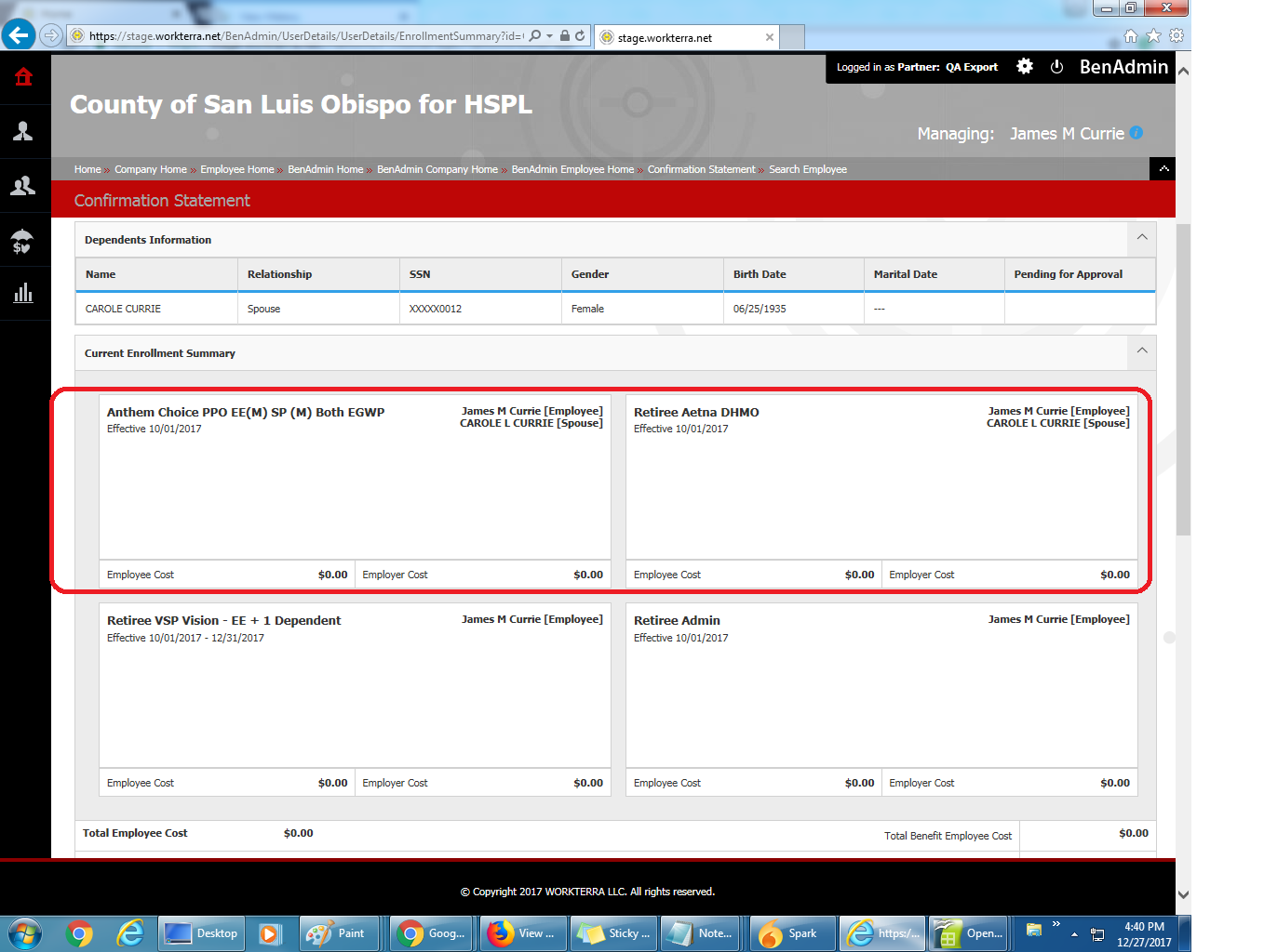 Another strange item we keep seeing, for retirees enrolling in vision for EE+1 a cost is not appearing on their confirmation statement once they enroll in the plan. They can see the cost before they hit enroll and then it disappears? See below example for James Currie. Not sure if this is just a confirmation statement issue or a bigger one, so I wanted to pass it along.