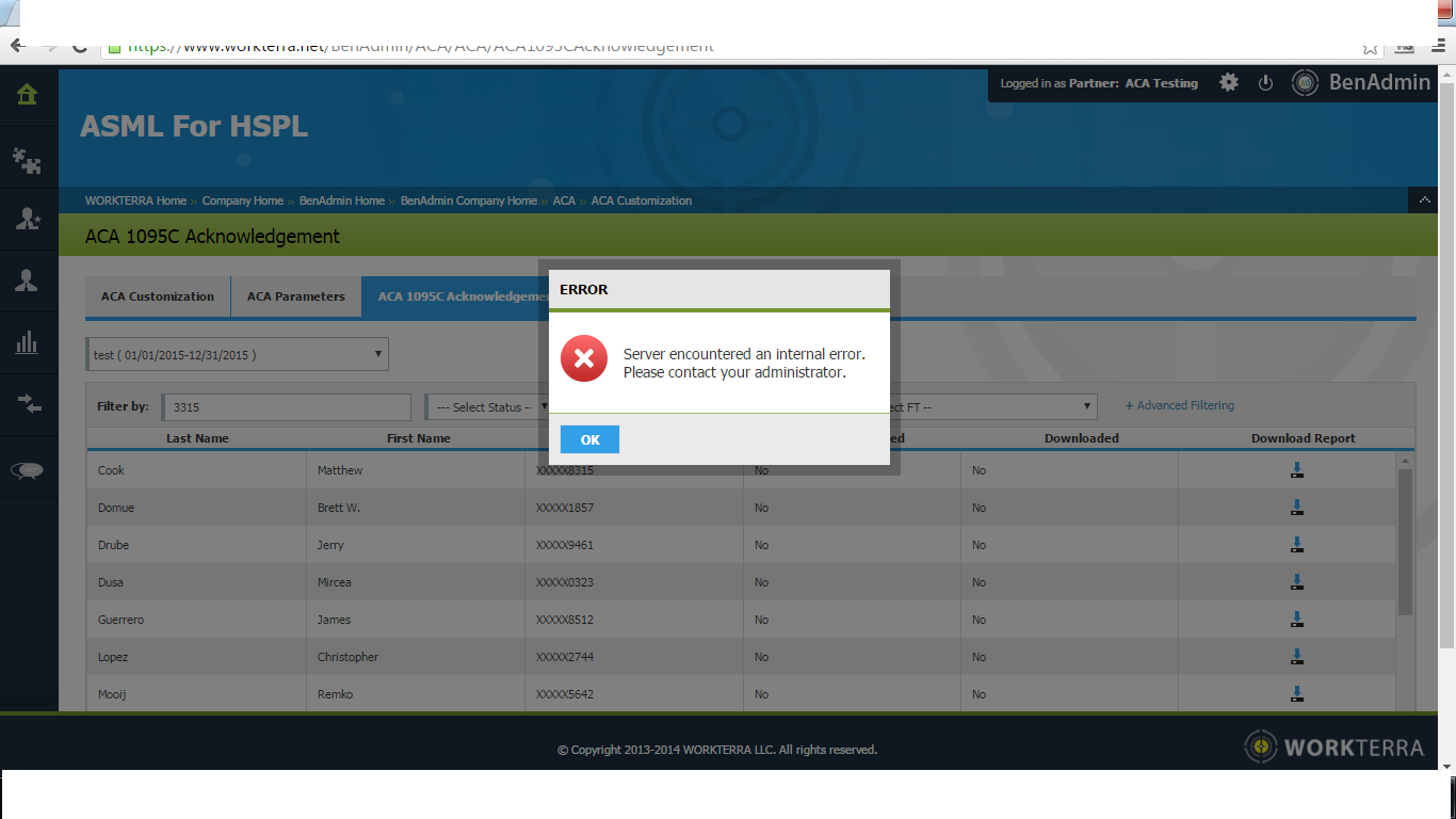 ACA_Getting server while searching an employee on ACA 1095-C Acknowledgement screen,