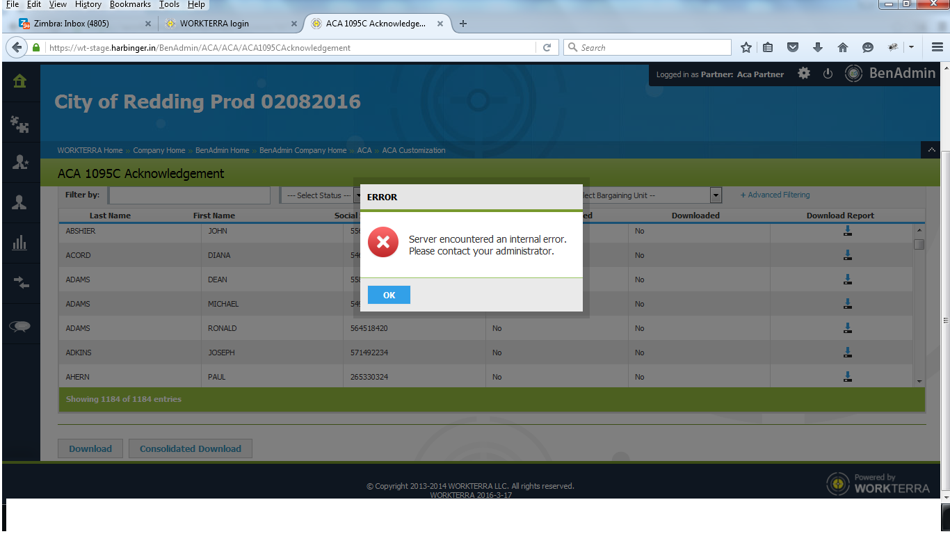 ACA_ACA 1095-C Acknowledgement_Performance issue_Getting server error on downloading report for employees 1184