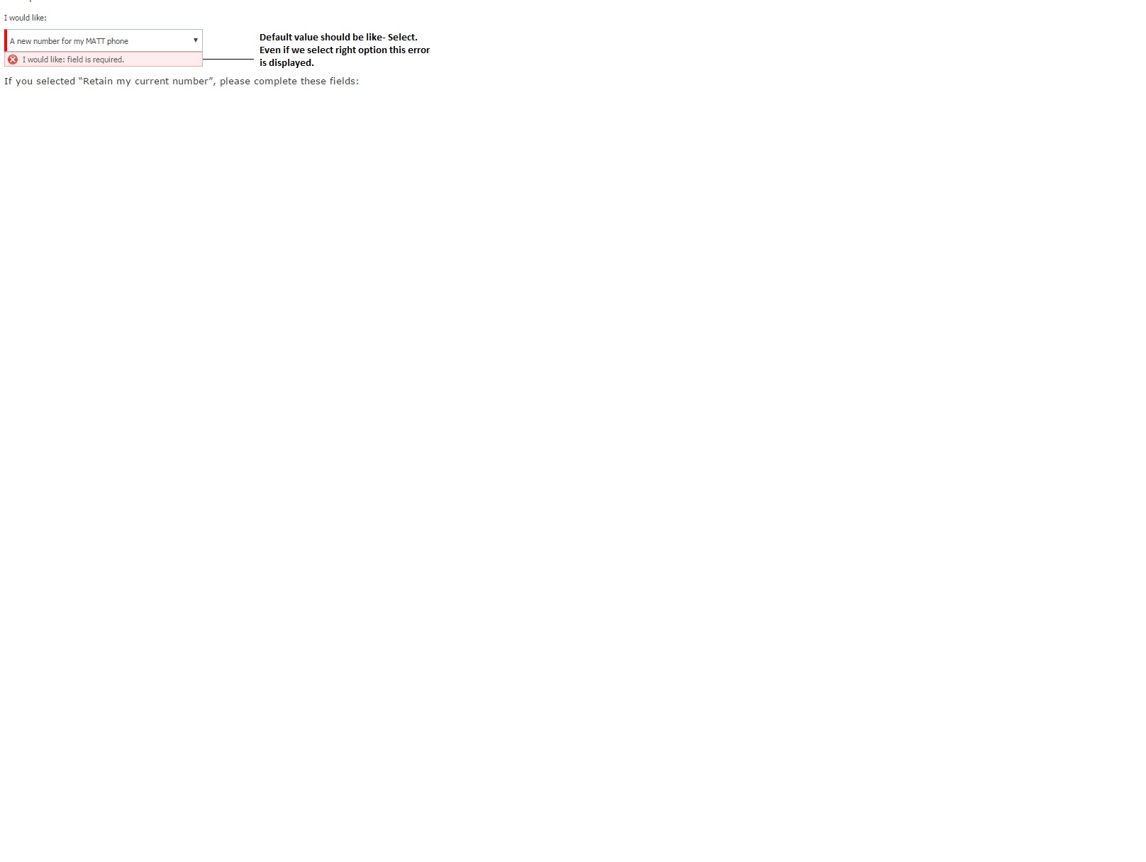 As per requirement ‘I would like’ drop down should have 2 choices- A new number for my MATT phone and To retain my current number for my MATT phone.