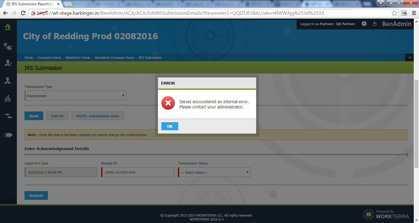 ACA - Getting server error on verify submission data on selection of transmission type as replacment