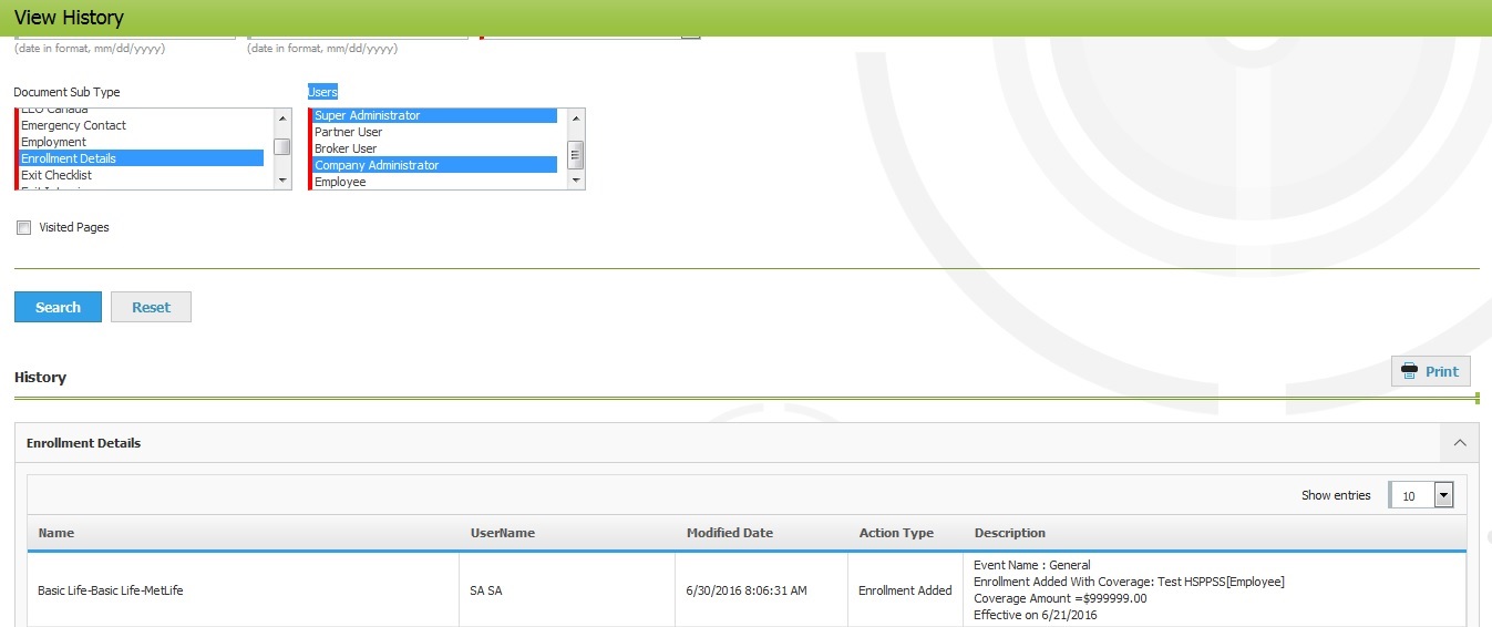 Steps:- Admin login -> Search employee -> Select employee from document type and enrollment details from Document Sub Type and company administrator ->Click search