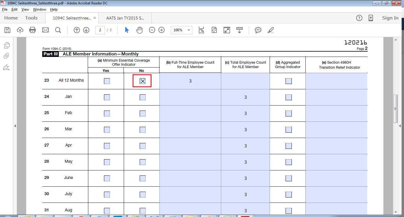 ACA - 1094C section a - minimum essential coverage offer indicator shows No for all months instead of No for first 5 and Yes for other 7 months
