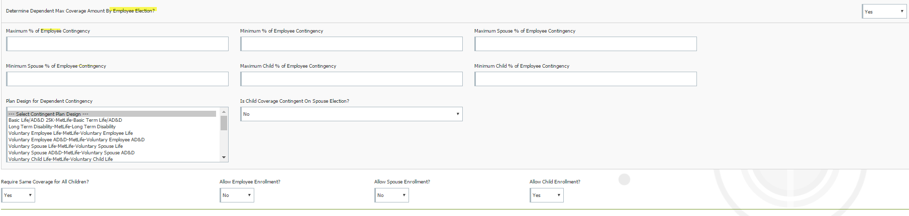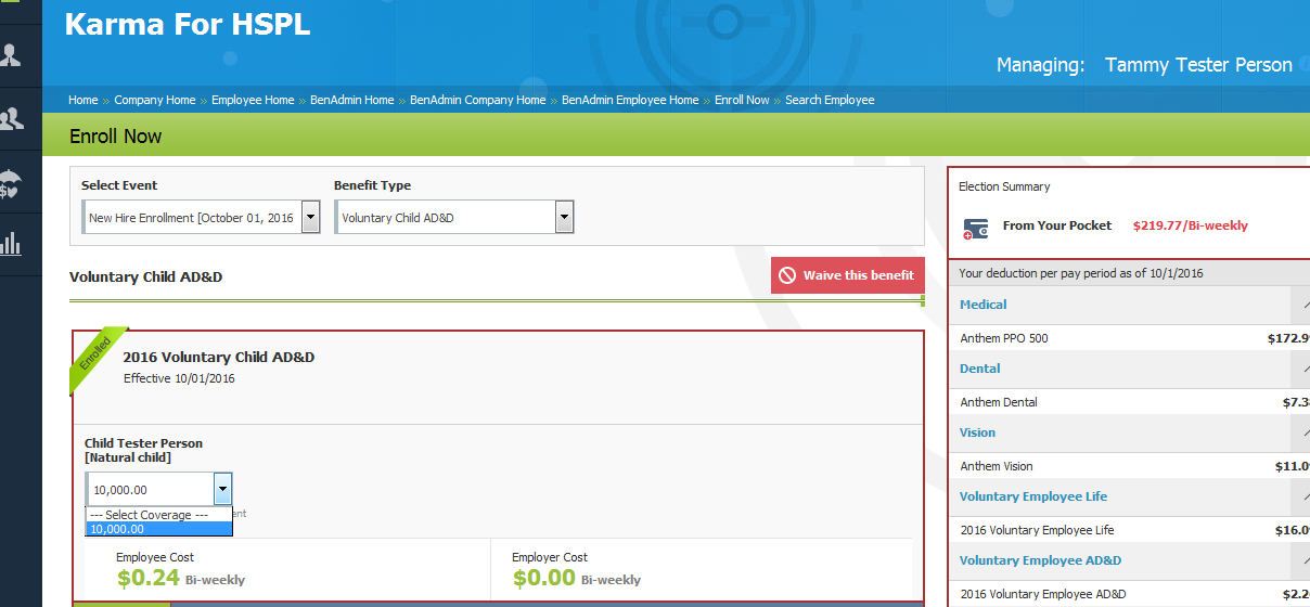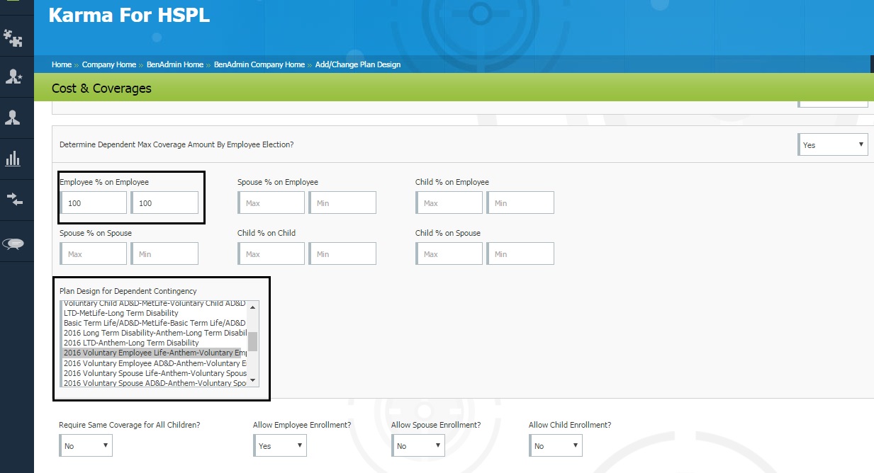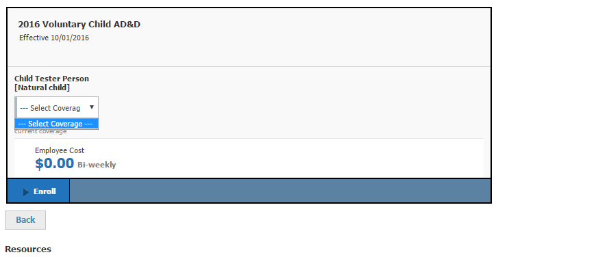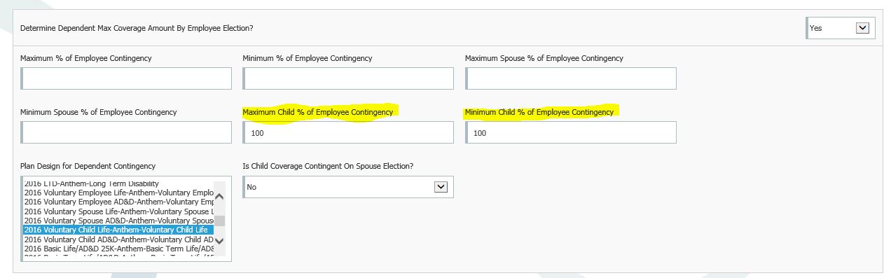 I am attempting to have the Child AD&D contingent upon being the same exact amount of the Child Life plan. I set the minimum and maximum coverage to 100% in attempts to do so. However, when I tried to enroll EE Cameron Adamson into the plan, the benefit appears but I am unable to enroll. Can you please review this? The screen shot is attached.