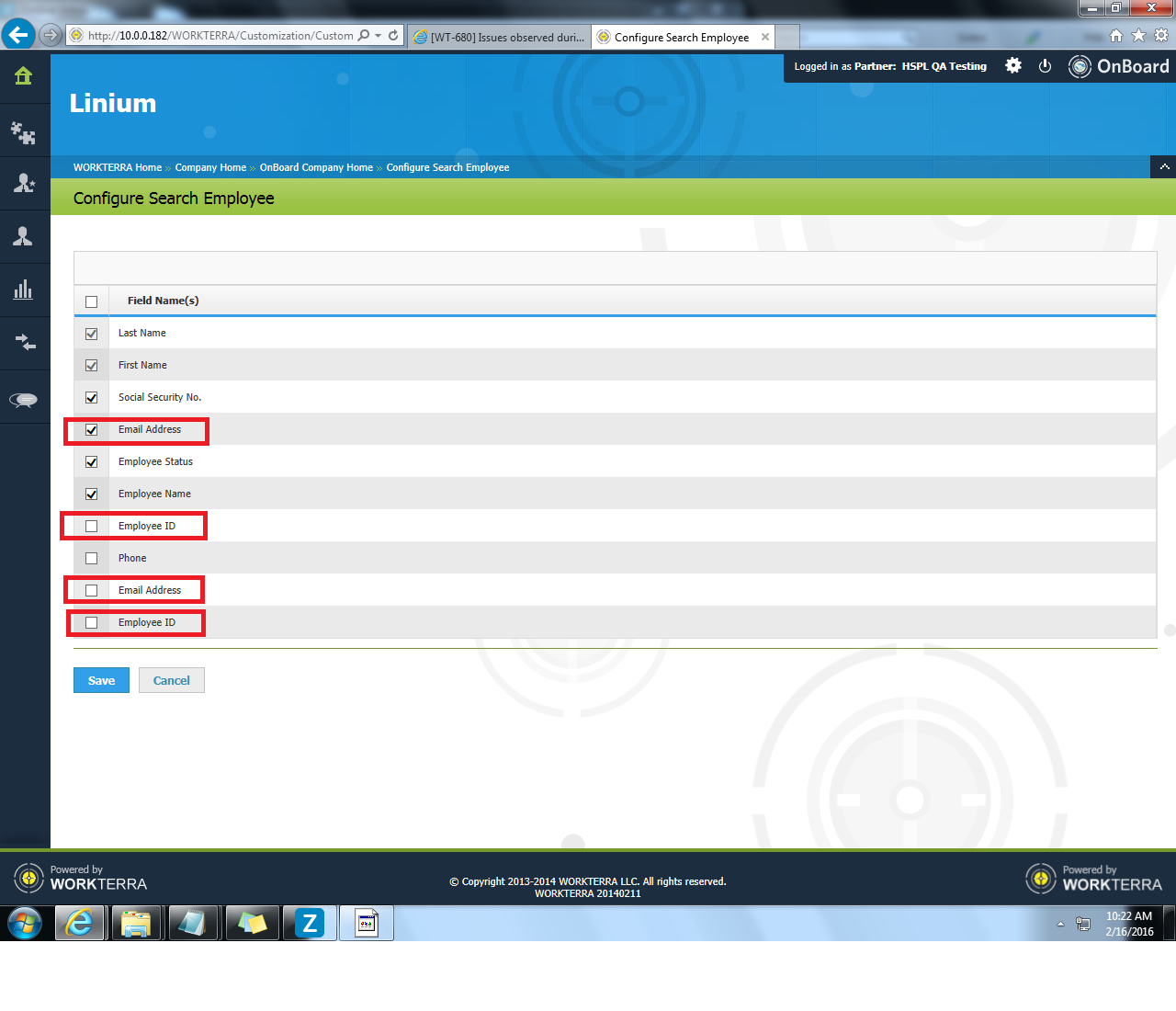 In Menu>>Customizer >>Employee Screen Configuration, Email Address and Employee ID fields are listed twice.