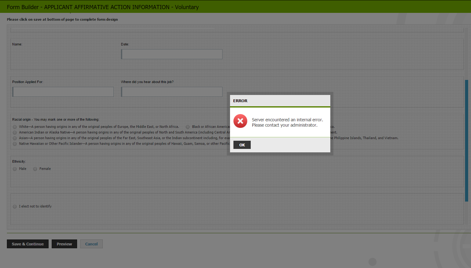 Prior to the error, I dragged and dropped one of the components. Afterwards, I began receiving the error. I have tried cancelling, deleting the form and starting over. I also tried logging out, logging back in and clearing my history and cashe. Nothing seems to be helping.