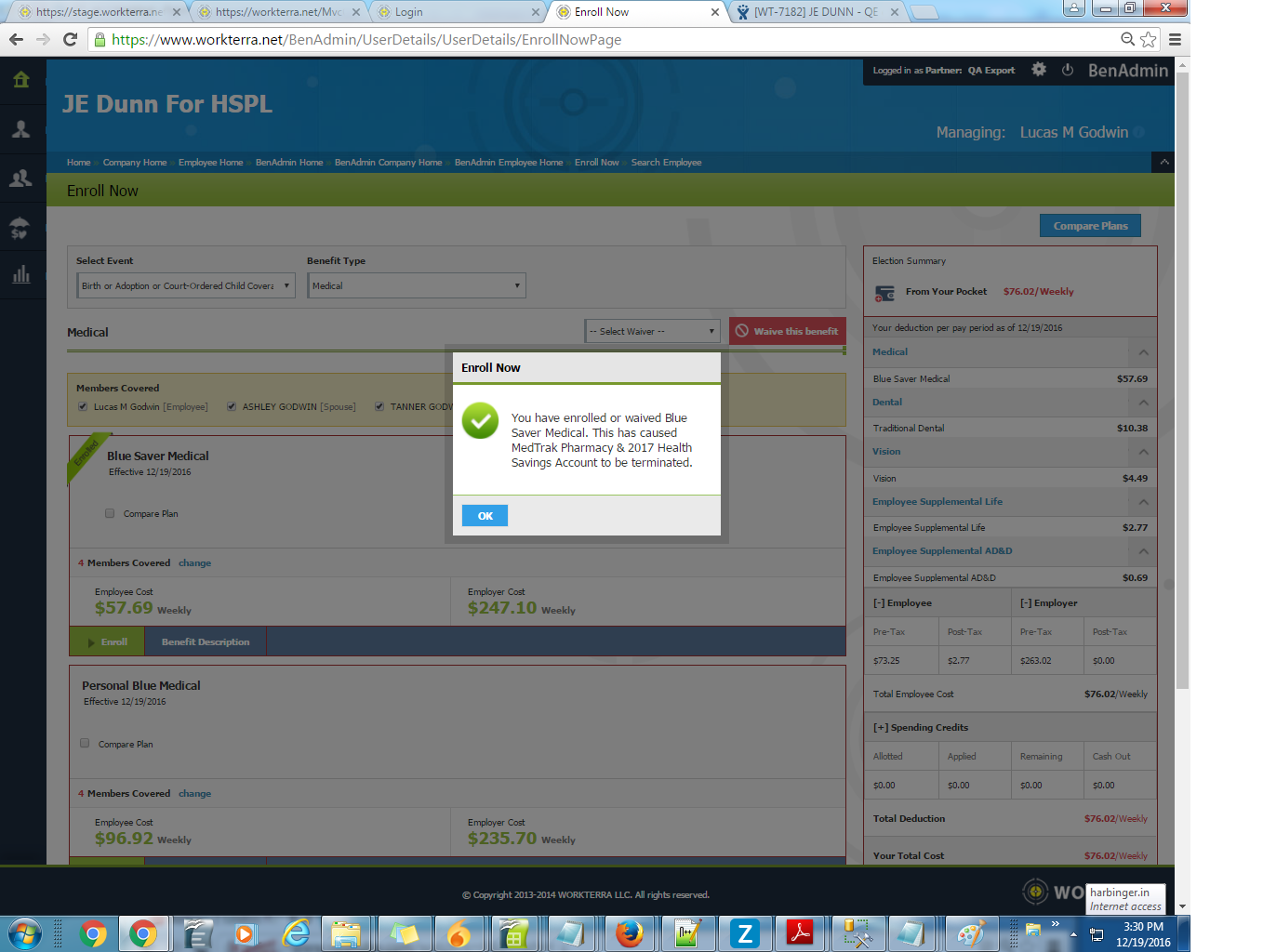 JE Dunn EE Lucas Godwin, had a QE of birth of a child and his HSA enrollment termed. In View History it appears as though Anne termed that enrollment but she confirmed she did not waive that benefits.