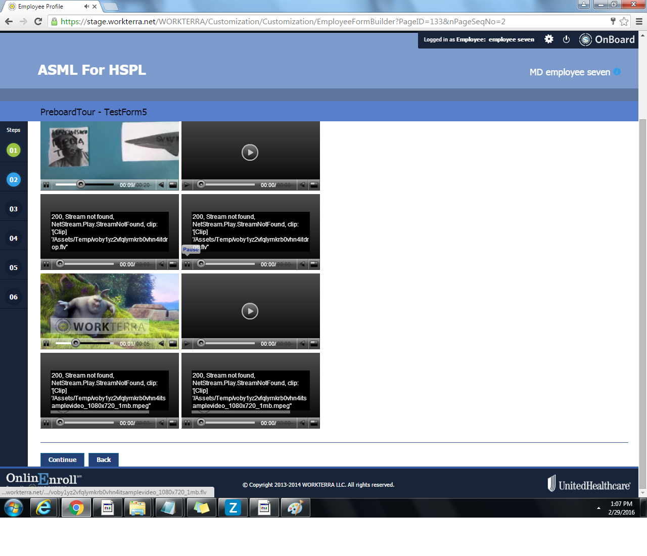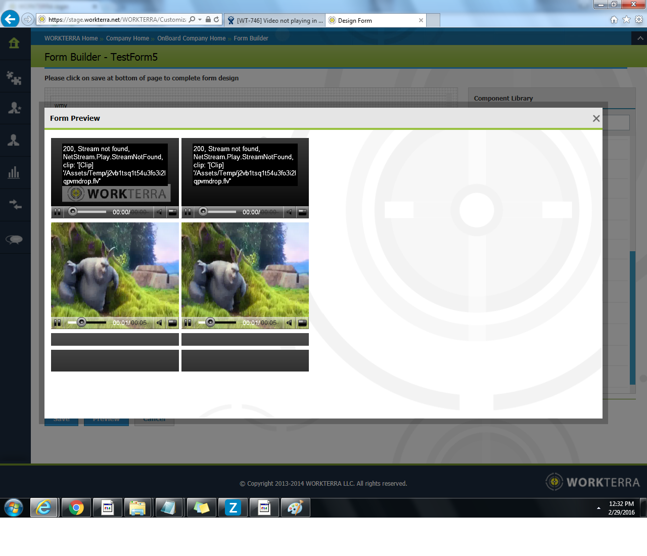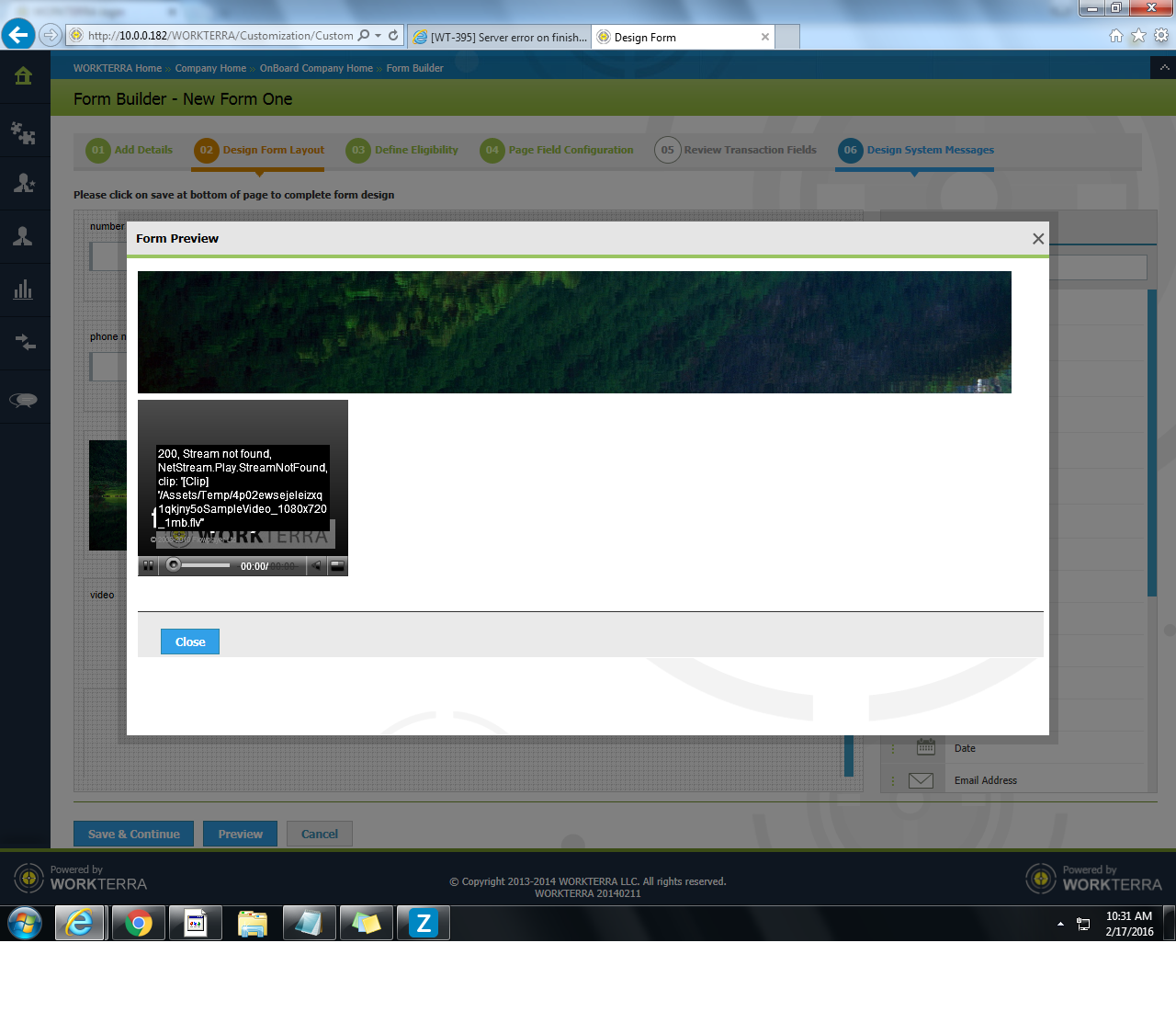 Though video file of recommended format and size is added in form, it does not work in Preview and Employee tours. Error, '200, Stream not found. NetStreme... ' is displayed.