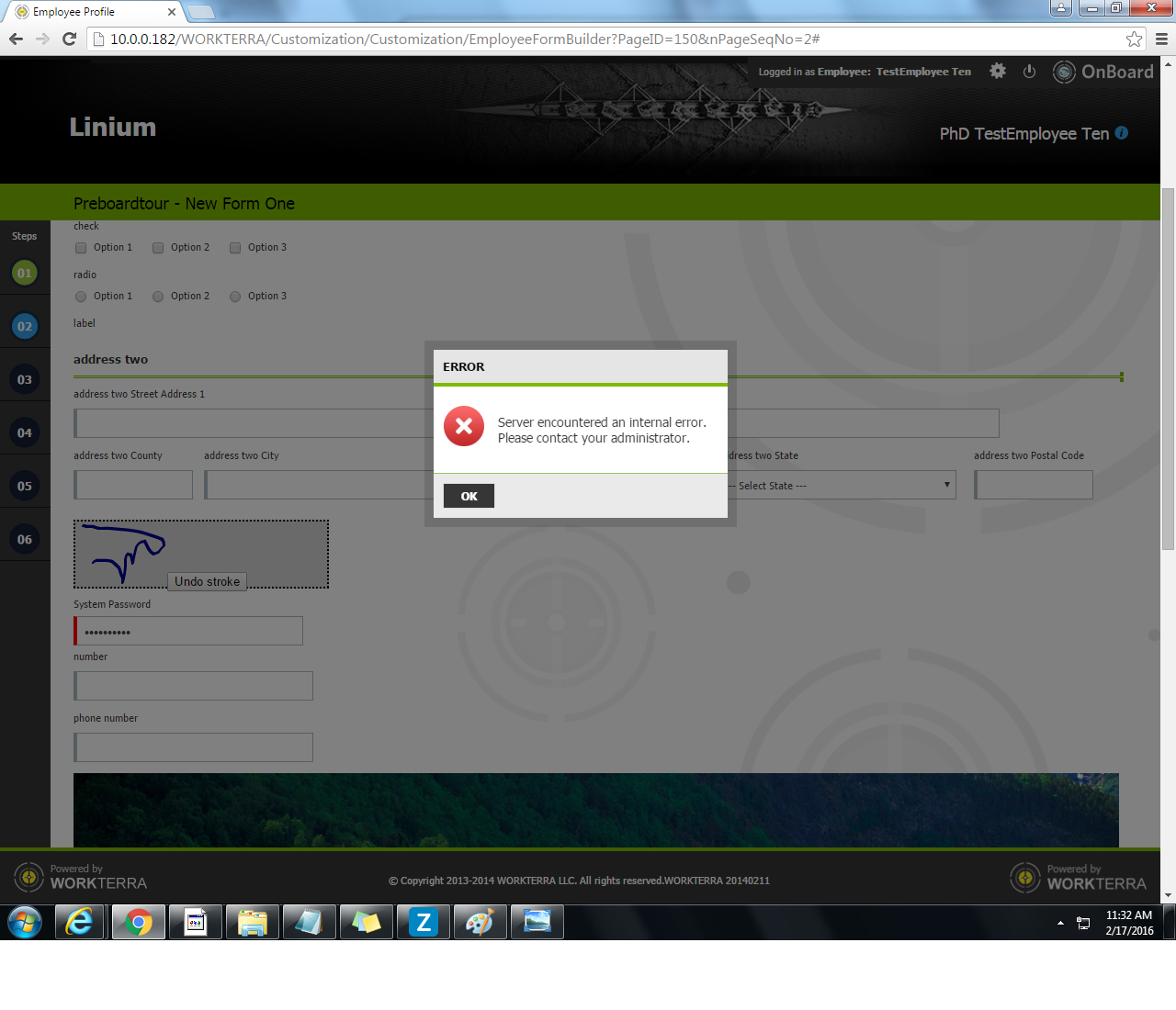 During pre-board tour, on custom form containing many from components, server error is occurred on Save and Continue button. PFA error log and screen shot