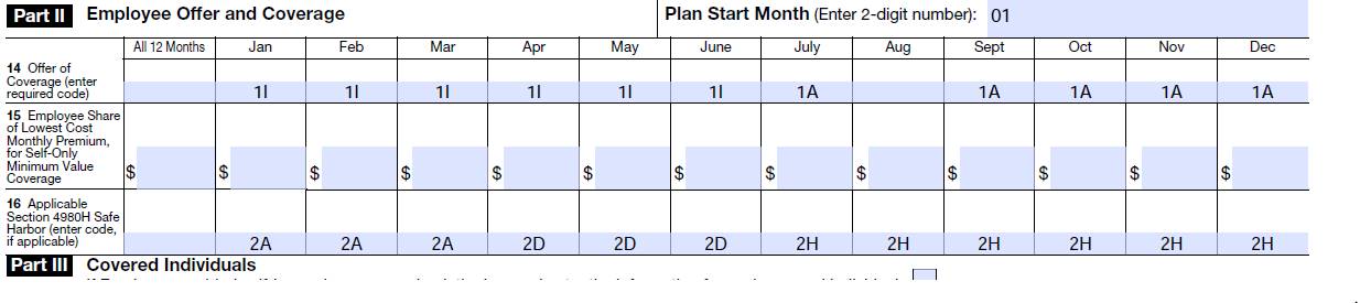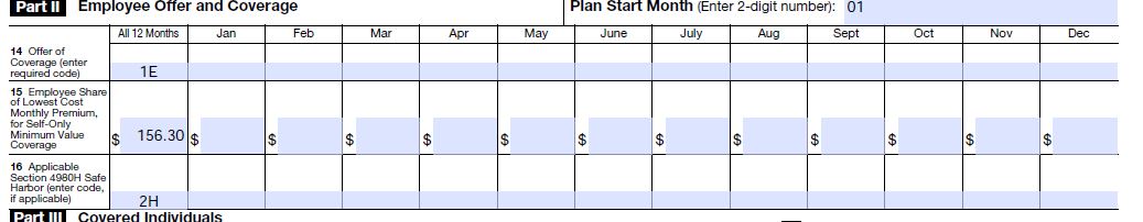 1. EE – Joseph Stenzel (stage) – He was enrolled in Medical for half the month of January. On the 1095C he is not coming up as enrolled in line 14and the covered individuals’ section is blank. For Line 16 the code shows 2B for January which means Not a fulltime employee for the month and not enrolled, but he was enrolled for partial month. This code does not seem right to me.