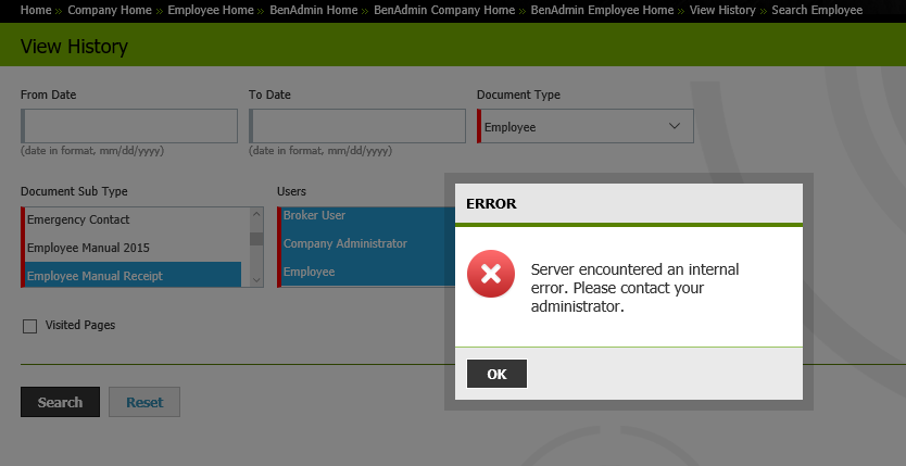When attempting to view "Employee Manual Receipt" history in managing employee's view history, I received an Internal Error. (can only view history in BenAdmin)