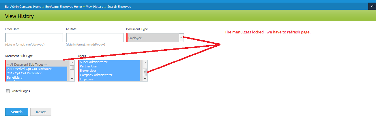 After selecting enrollment details or future enrollment details we get message displayed “user has view only rights” when you proceed further the entire menu gets locked and we have to again refresh the page (Refer screen shot view history 2)